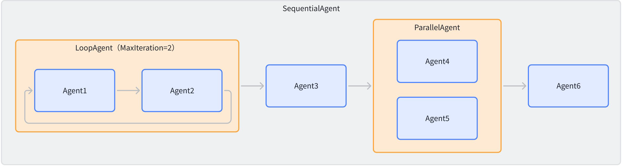 • Agent2: [SequentialAgent, LoopAgent, Agent1, Agent2]