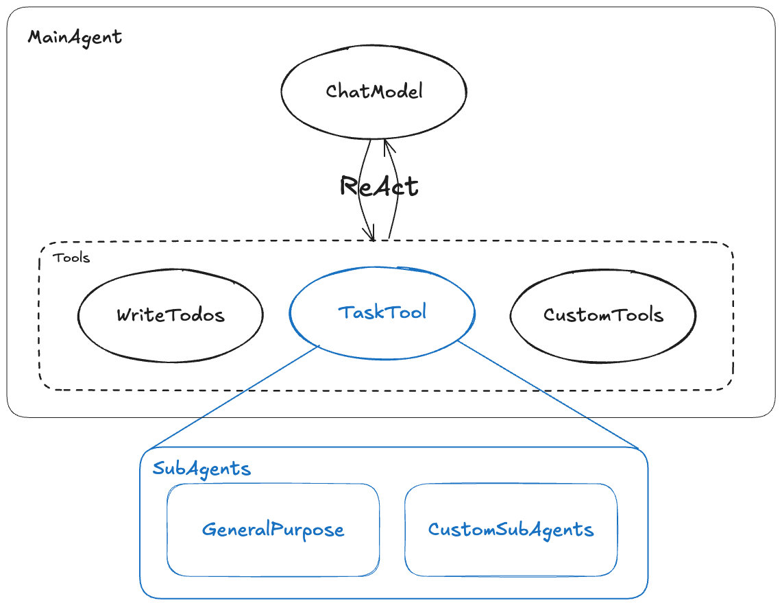 ChatModelAgent is the most important pre-built component in ADK. It encapsulates the interaction logic with large language models and implements the classic ReAct (Reason-Act-Observe) pattern. The running process is: