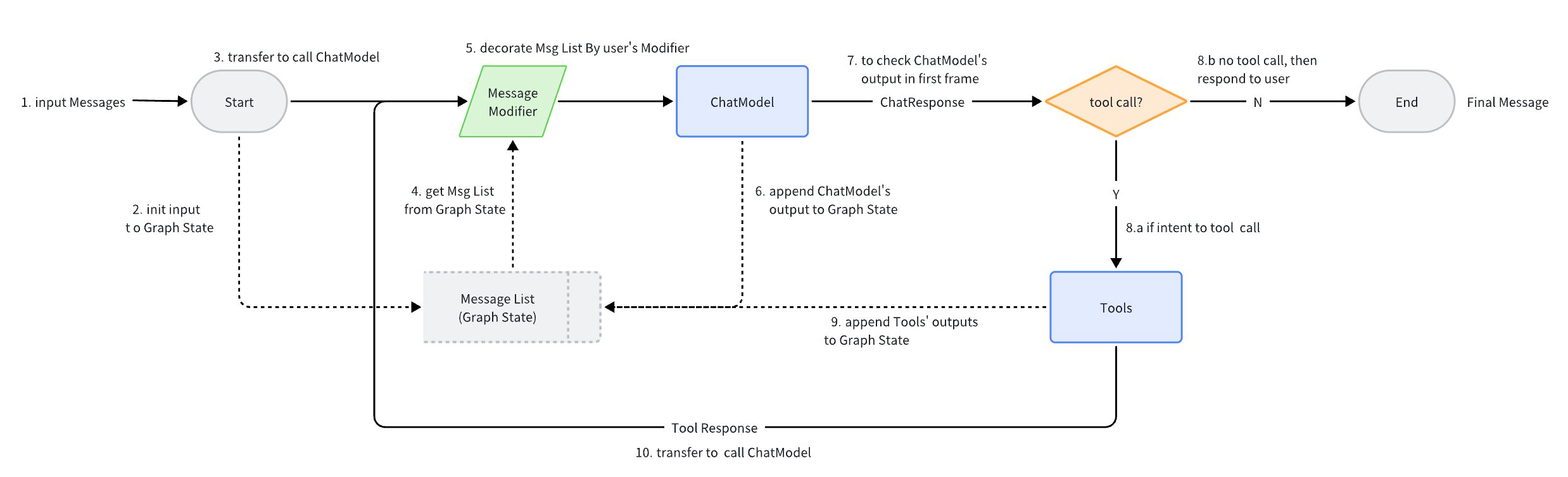 Taking the ReAct Agent as an example: a ChatModel (LLM) “binds” Tools, receives input Messages, and the ChatModel autonomously determines whether to call a Tool or output the final result. Tool execution results become Messages fed back to the ChatModel as context for the next round of autonomous judgment.