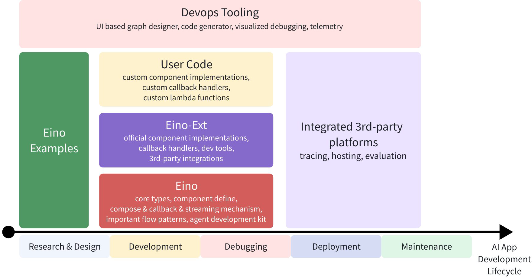Eino is an LLM application development framework covering the entire DevOps lifecycle, from best practice examples in Eino Examples to toolchains at each stage, all within Eino’s domain: